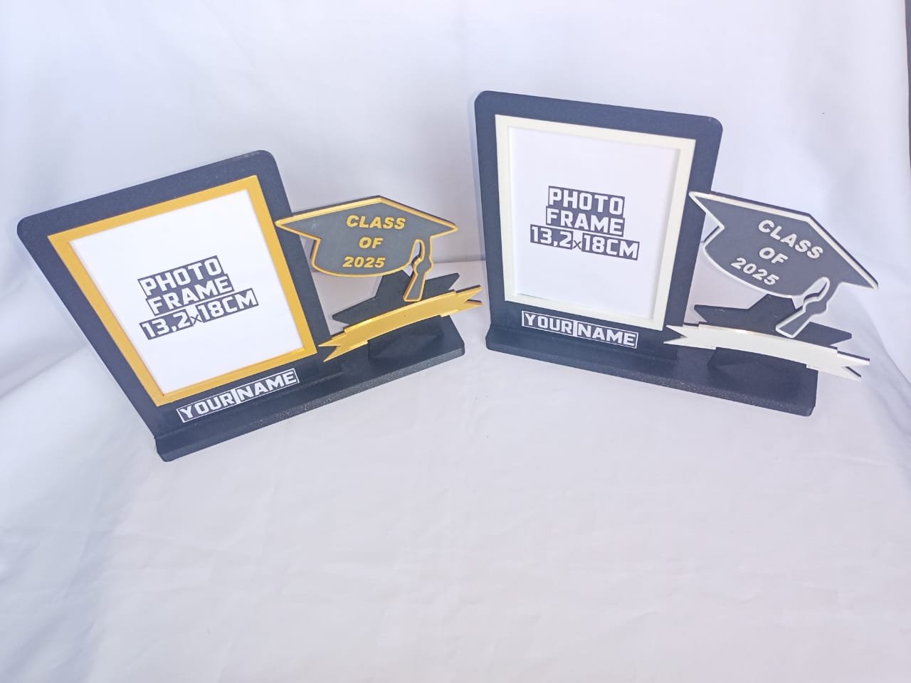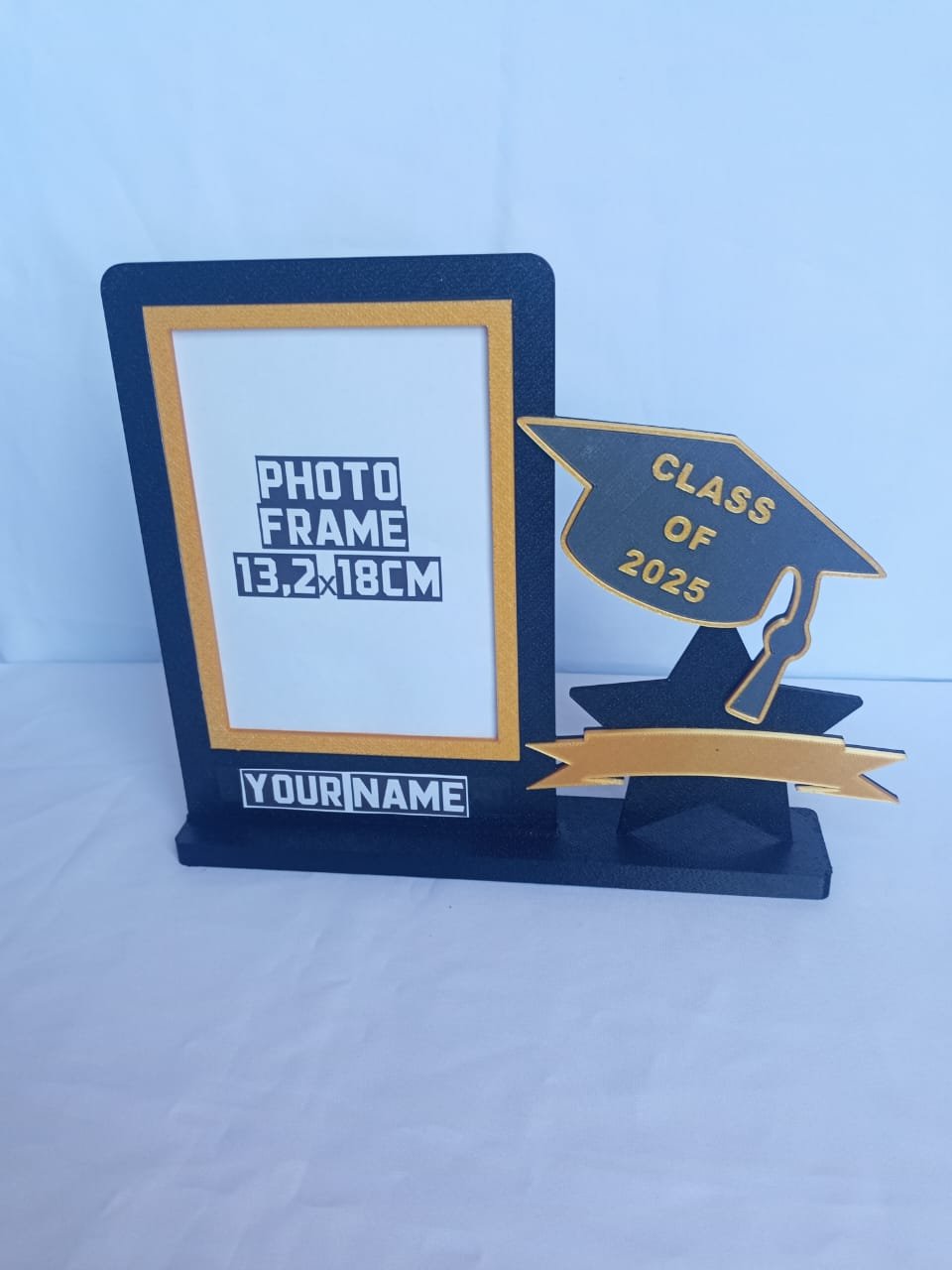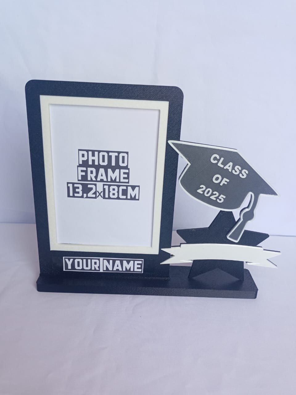 Celebrate academic milestones with this bold, commemorative photo frame. Featuring a classic graduation cap, silhouette design, and space for a 13×18 cm photo, it’s the perfect gift or display piece. Personalize with your name or message for a truly special touch.