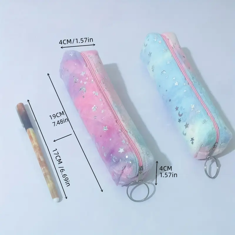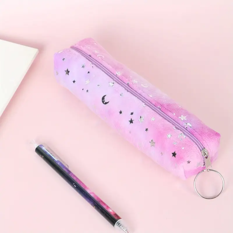 • A pastel gradient pencil case (purple to pink) adorned with silver moon and star stickers