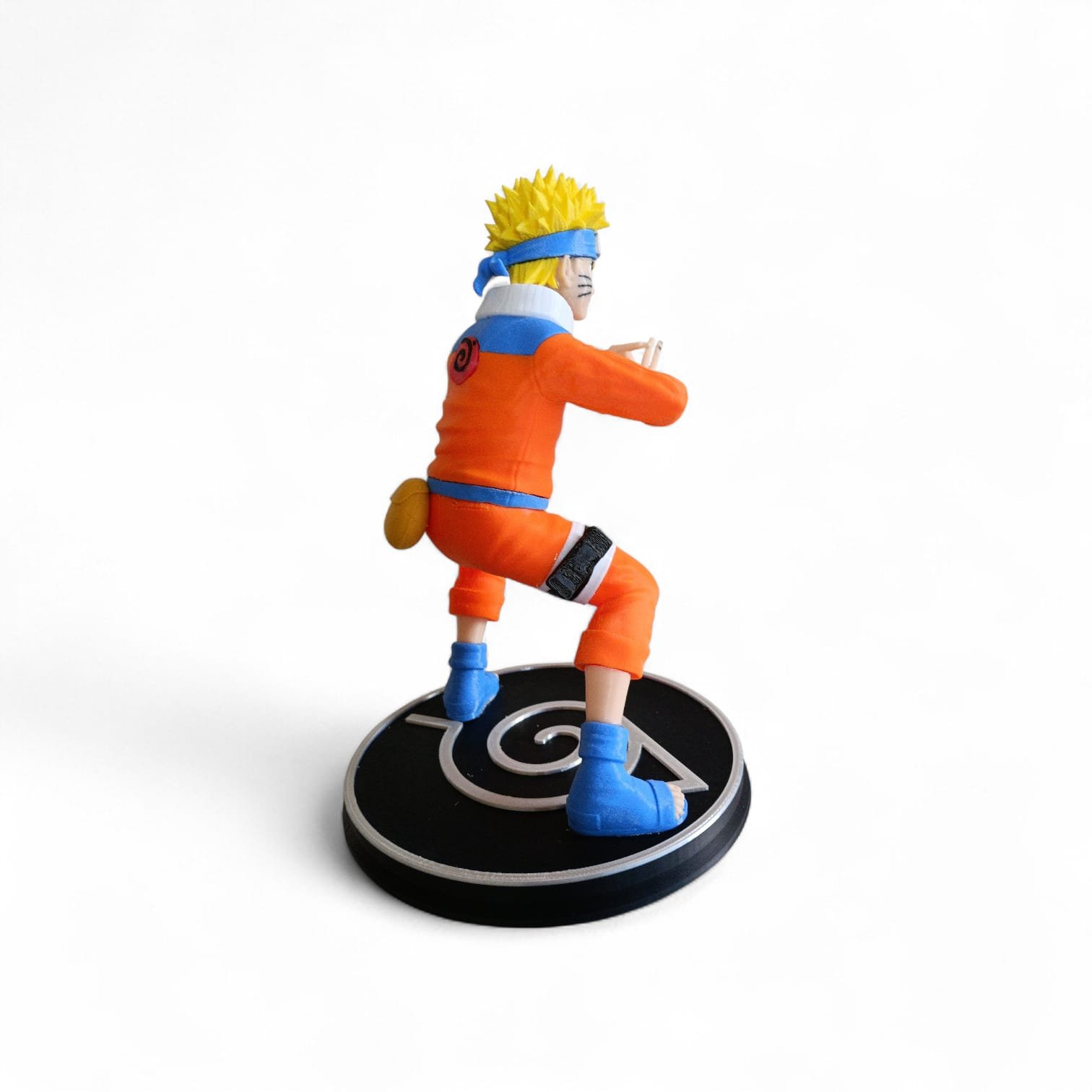 This 3D printed figurine captures Naruto Uzumaki in his iconic crouched stance, performing a hand sign that symbolizes his mastery of ninjutsu. Dressed in his classic orange and blue outfit with the Hidden Leaf Village headband, the model stands on a circular black base featuring the village crest in silver. With its raw, unpainted finish, this piece is perfect for collectors who enjoy displaying authentic prints or hobbyists who want to customize their own paintwork.